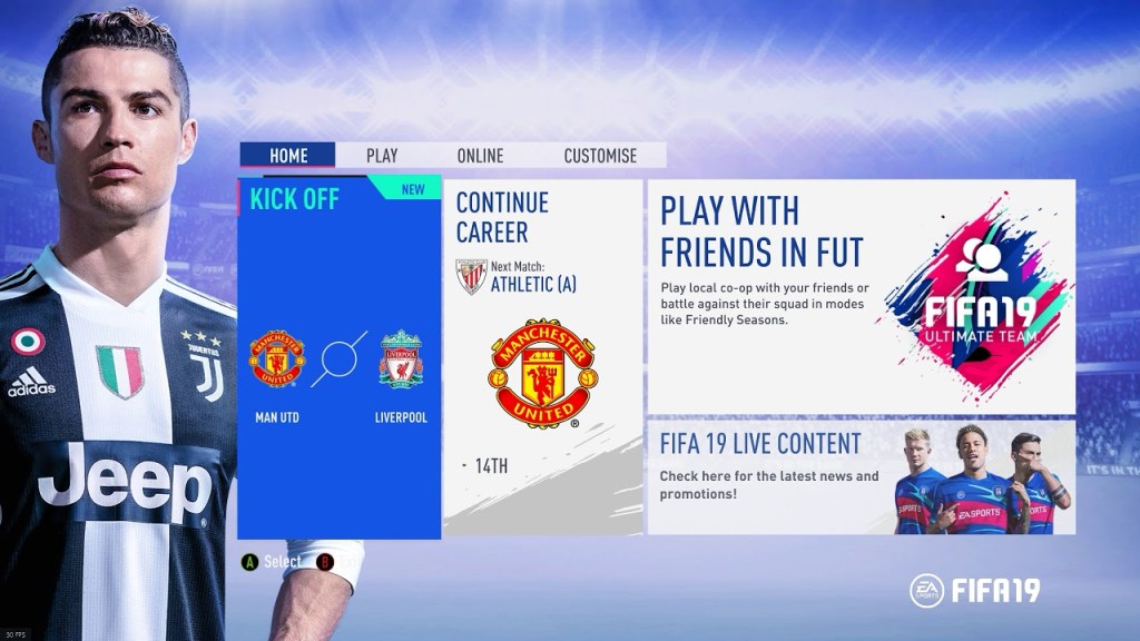 En esta imagen podemos ver como es el menú principal de FIFA 19. En la pestaña que pone » PLAY » tienes la opción de jugar en el modo «offline», en el que solo puedes jugar contra la CPU, o contra otra persona, siempre y cuando estéis en la misma consola.